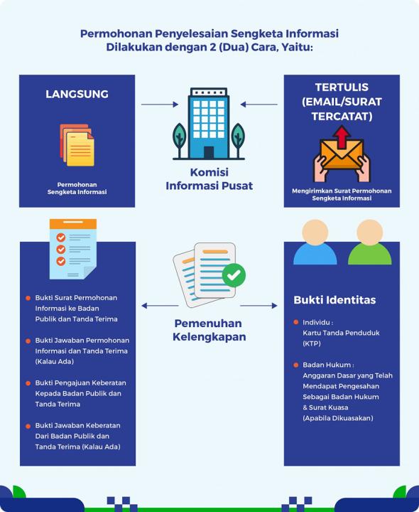 - Upaya penyelesaian Sengketa Informasi Publik diajukan kepada Komisi Informasi Pusat dan/atau Komisi Informasi provinsi dan/atau Komisi Informasi kabupaten/kota sesuai dengan kewenangannya apabila tanggapan atasan Pejabat Pengelola Informasi dan Dokumentasi dalam proses keberatan tidak memuaskan Pemohon Informasi Publik.
